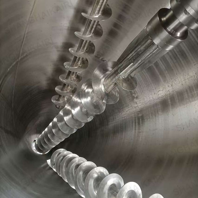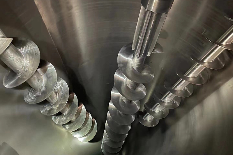 混合機三條螺旋(二條對稱排列螺旋及中間一條長螺旋)的快速自轉(zhuǎn),將物料向上提升,形成三股沿筒壁自下向上的螺柱形物料流,長螺旋運轉(zhuǎn)解決了中間物料混合的盲區(qū)及底部死角,