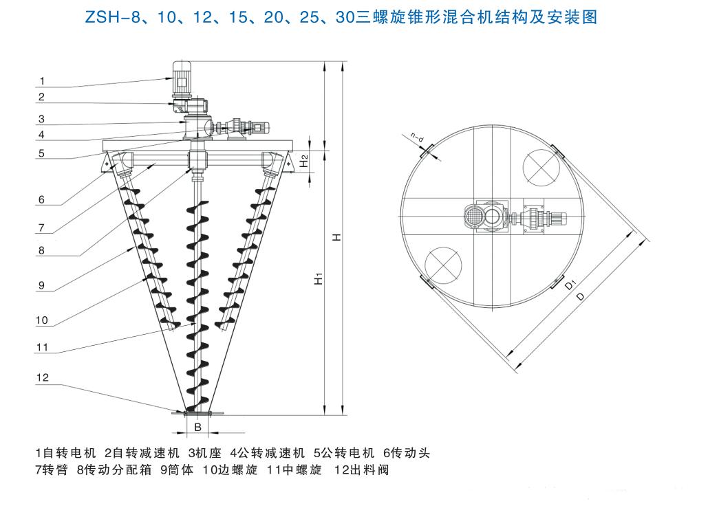 注:創(chuàng)新改進(jìn)型ZSH三螺旋錐形混合機:2、3、4、5、6(m3)可按用戶要求定制,有關(guān)尺寸以雙螺旋尺寸為準(zhǔn)。