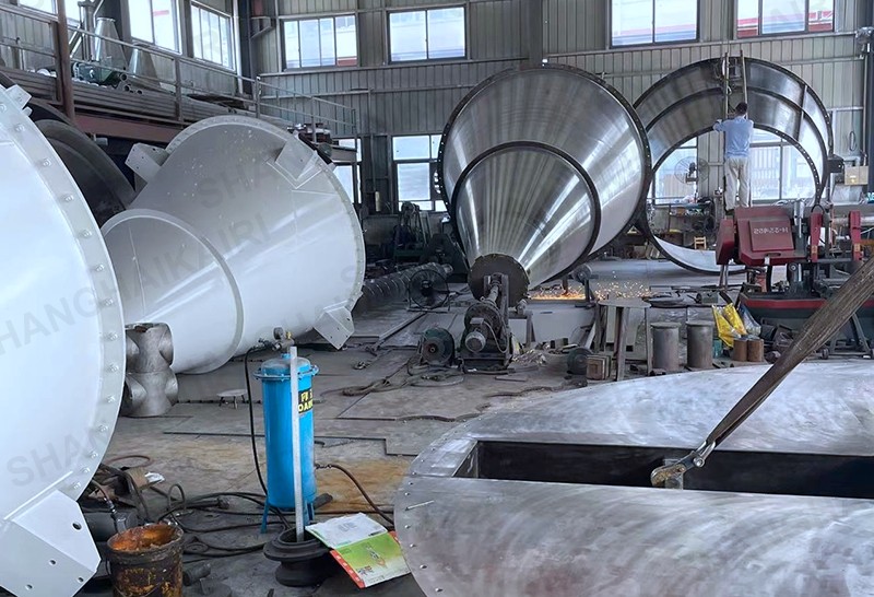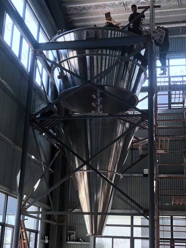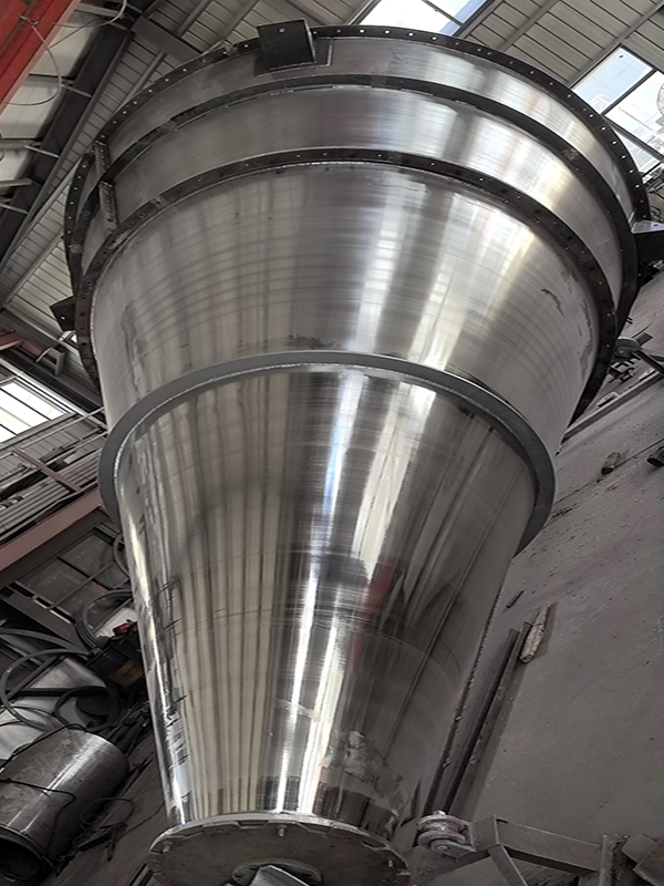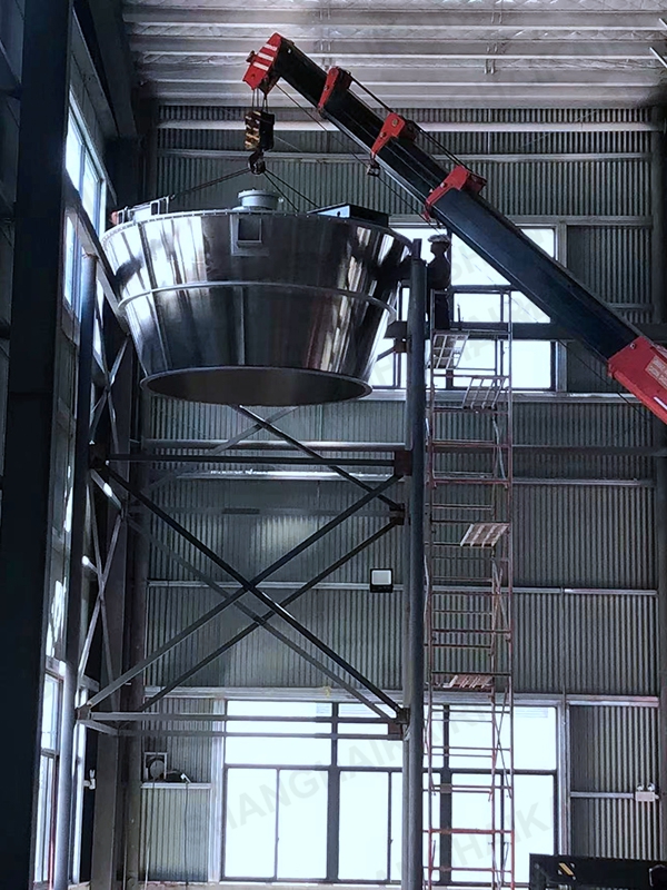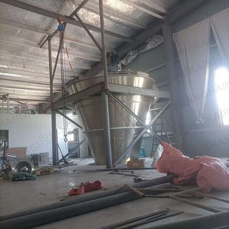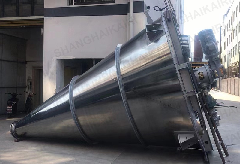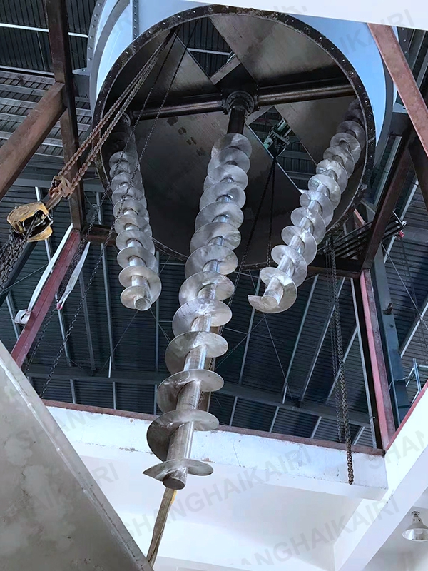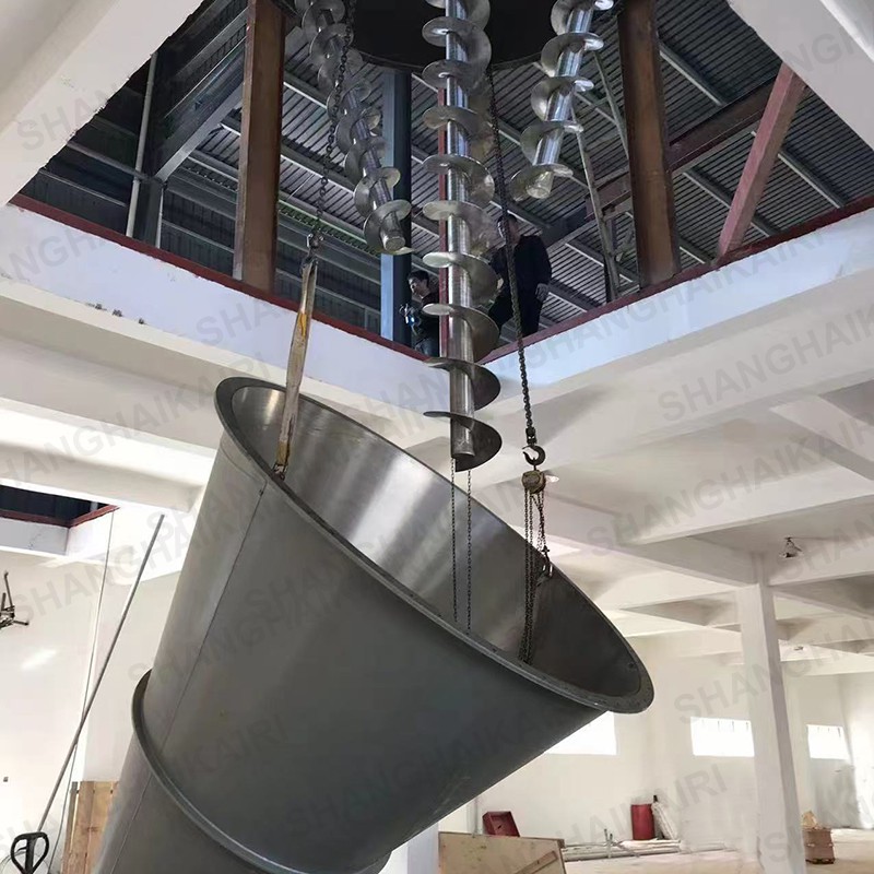 錐形三螺旋混合機(8m3以上):在原雙螺旋錐形混合機基礎(chǔ)上系統(tǒng)進(jìn)行創(chuàng)新改進(jìn),增加一條螺旋,采用兩條對稱排列螺旋及中間一條長螺旋(葉片加大)運轉(zhuǎn),原長螺旋斜度大、壓力大、今縮短螺旋長度牢固,增加螺旋的強度,使得三條螺旋比現(xiàn)有的雙螺旋運行更加的穩(wěn)定,螺旋越多,混合效果越明顯,解決了中間物料攪拌的盲區(qū)及死角,底部物料不斷往上提升,混合精度更高,提高生產(chǎn)率,保證質(zhì)量,使設(shè)備壽命增長。采用該系列機提升混合效果,解決了用戶對特輕、特細(xì)等物料難以混合均勻的困難,對密度大等物料更加適用,同時對一般物料速度、精度均有明顯提高,減少混合時間,具有節(jié)能意義。