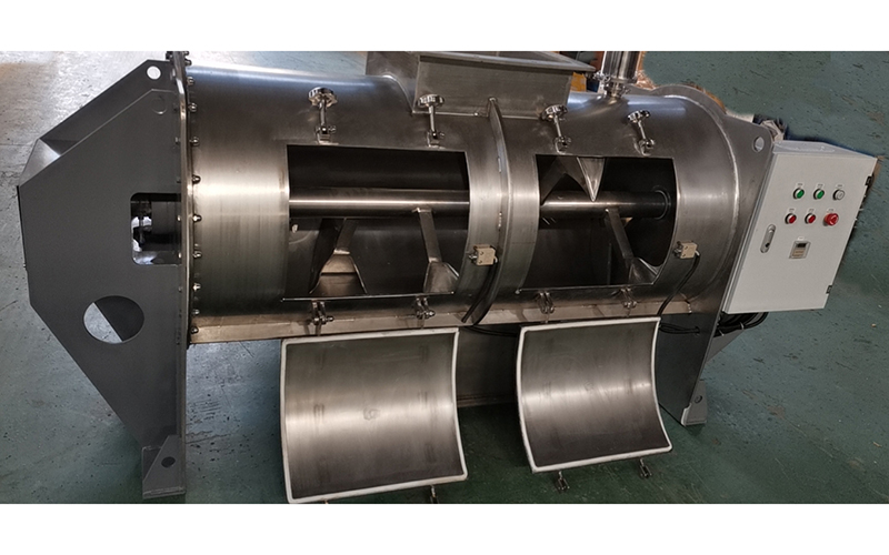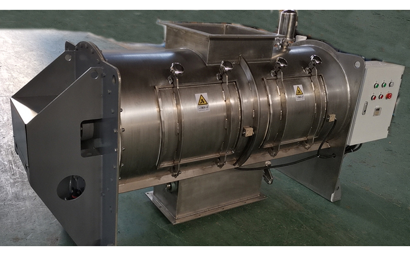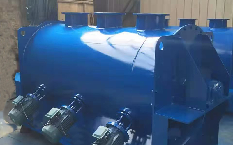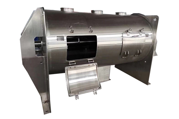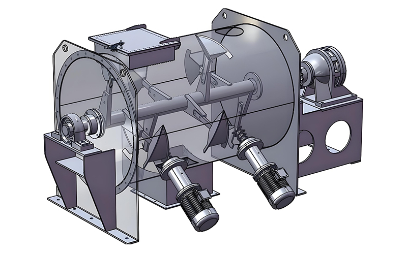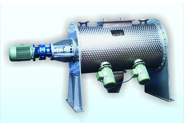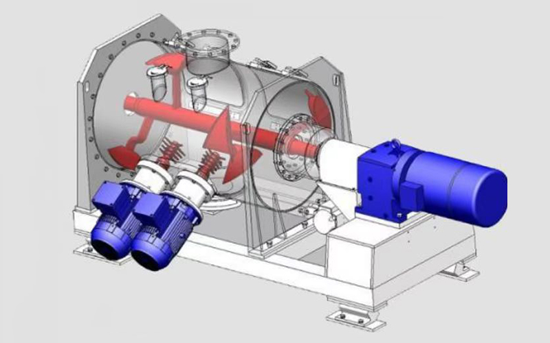 混合機啟動后,犁刀由犁刀軸帶動旋轉,使物料沿筒體徑向作周向湍動,同時把物料沿犁刀兩側面的法線方向拋出。當被拋出和作周向湍動的物料流經飛刀組時,被高速旋轉的飛刀迅速、有力地拋散。物料在上述犁刀和飛刀的復合作用下,使物料不停的對流、翻動、不斷更疊、擴散、從而在短時間內達到均勻混合,混合精度高。
